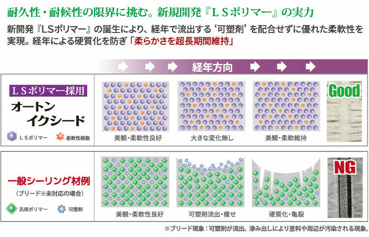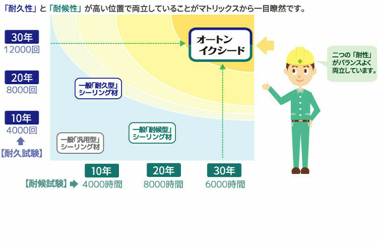 お世話になっております。今回は耐用年数15年超のオートンイクシード後打ちで打ち替えさせていただきました。一般的なコーキング材と比べると長持ちしますので、より長く安心できるかと思います。
